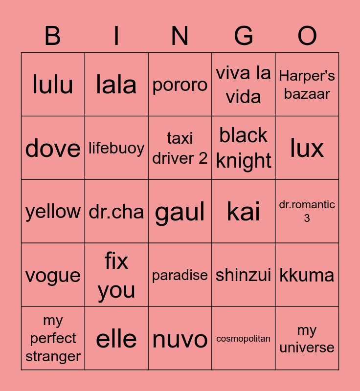 This bingo card has 25 words: vogue, elle, gaul, cosmopolitan, Harper's bazaar, lulu, lala, pororo, kai, kkuma, dove, lifebuoy, nuvo, shinzui, lux, my perfect stranger, dr.cha, taxi driver 2, black knight, dr.romantic 3, yellow, fix you, paradise, viva la vida and my universe.