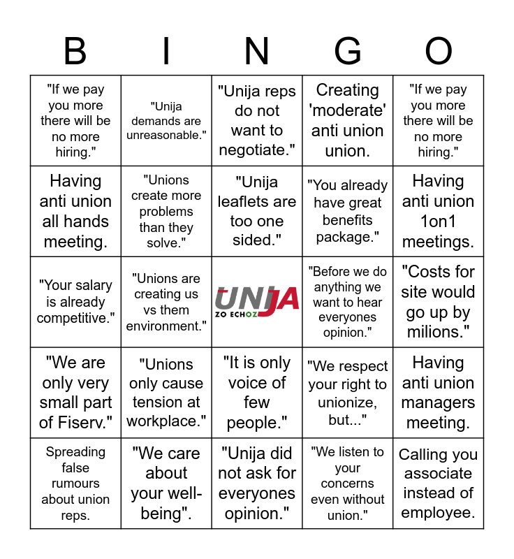 This bingo card has a free space and 24 words: "Unions only cause tension at workplace.", "We care about your well-being"., "Unija leaflets are too one sided.", Spreading false rumours about union reps., "If we pay you more there will be no more hiring.", "If we pay you more there will be no more hiring.", Having anti union all hands meeting., "Unija demands are unreasonable.", "Before we do anything we want to hear everyones opinion.", "It is only voice of few people.", "You already have great benefits package.", "Your salary is already competitive.", "We respect your right to unionize, but...", Having anti union managers meeting., "Unions create more problems than they solve.", "We listen to your concerns even without union.", "Costs for site would go up by milions.", "Unija reps do not want to negotiate.", Having anti union 1on1 meetings., "Unions are creating us vs them environment.", Calling you associate instead of employee., "We are only very small part of Fiserv.", Creating 'moderate' anti union union. and "Unija did not ask for everyones opinion.".