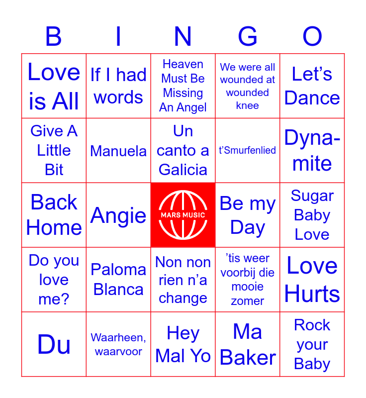 This bingo card has a free space and 40 words: Huilen is voor jou te laat, Back Home, El Condor Pasa (If I could), Manuela, Waarheen, waarvoor, Non non rien n’a change, Un canto a Galicia, Sacramento, Let’s Dance, Do you love me?, Angie, We were all wounded at wounded knee, Rock your Baby, Sugar Baby Love, Be my Day, Paloma Blanca, The Elephant Song, Love is All, Dancing Queen, Heaven Must Be Missing An Angel, Love Hurts, Ma Baker, t’Smurfenlied, Give A Little Bit, You’re the one that I want, Only A Fool, Rivers of Babylon, I was made for lovin’ you, Quiereme Mucho, Bright Eyes, In the Summertime, Du, Ich habe die liebe geseh’n, ’tis weer voorbij die mooie zomer, Dyna-mite, Hey Mal Yo, Mon Amour, You’re my world, If I had words and Chiquitita.