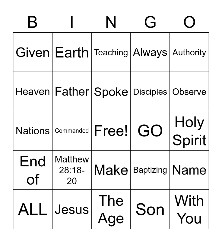 This bingo card has a free space and 24 words: Matthew 28:18-20, Jesus, Spoke, ALL, Authority, Given, Heaven, Earth, GO, Make, Disciples, Nations, Baptizing, Name, Father, Son, Holy Spirit, Teaching, Observe, Commanded, With You, End of, Always and The Age.