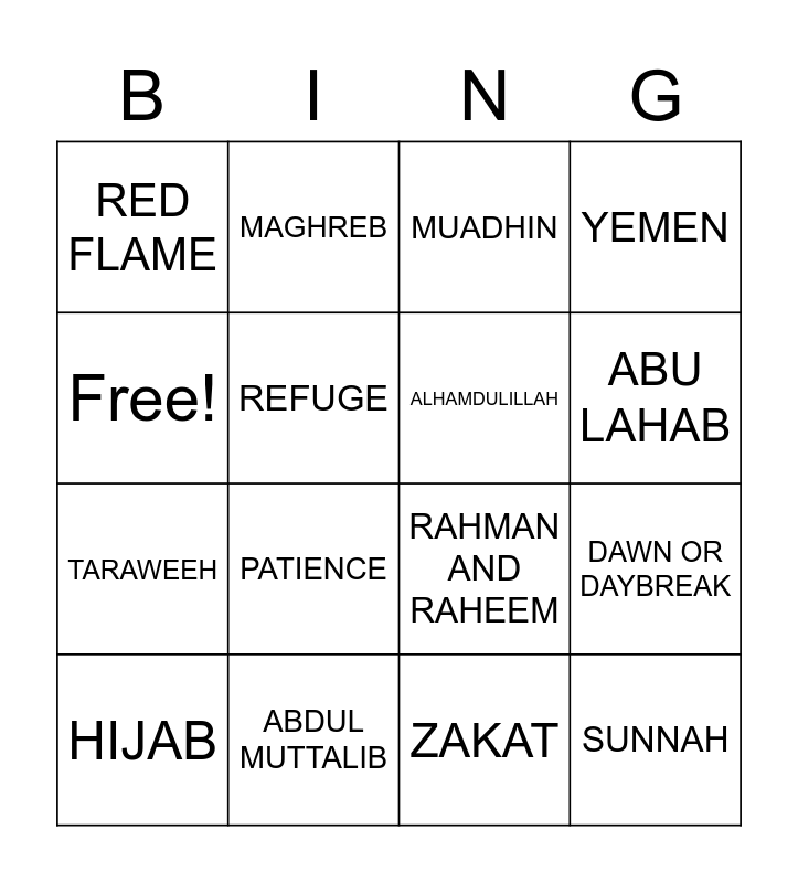This bingo card has 16 words: ABDUL MUTTALIB, DAWN OR DAYBREAK, MUADHIN, RED FLAME, TARAWEEH, MAGHREB, RAHMAN AND RAHEEM, ZAKAT, Free!, REFUGE, HIJAB, YEMEN, PATIENCE, ABU LAHAB, ALHAMDULILLAH and SUNNAH.