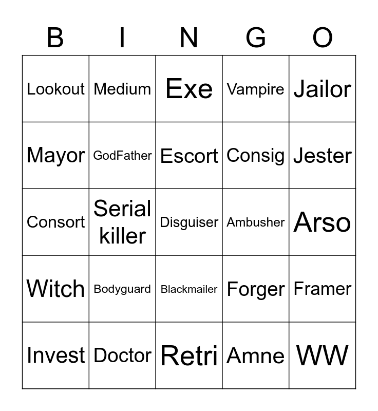 This bingo card has a free space and 24 words: Bodyguard, Doctor, Escort, Invest, Jailor, Lookout, Mayor, Medium, Ambusher, Blackmailer, Consig, Consort, Forger, Framer, GodFather, Amne, Arso, Exe, Jester, Serial killer, WW, Witch, Vampire and Retri.