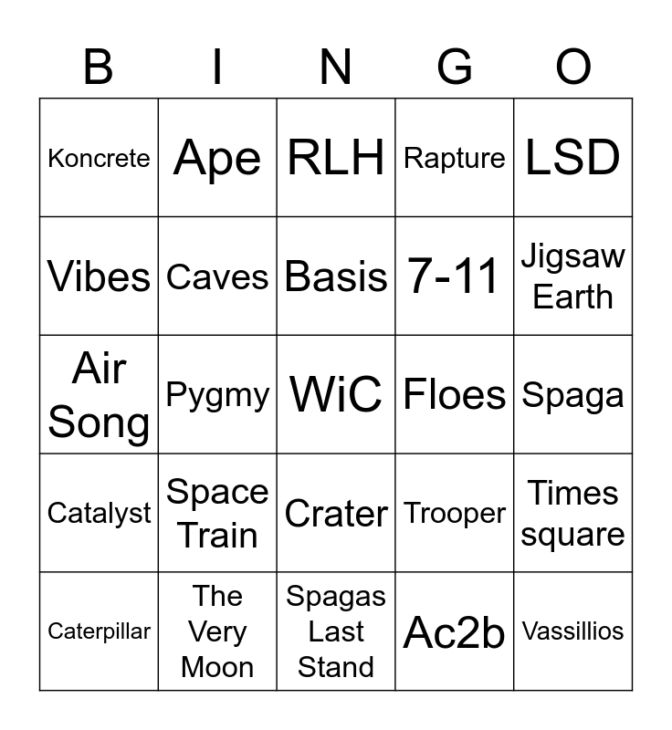 This bingo card has a free space and 24 words: Space Train, The Very Moon, Basis, Caterpillar, LSD, Koncrete, Vibes, Ape, Floes, Crater, 7-11, Air Song, Trooper, Times square, Caves, Ac2b, Spaga, RLH, Jigsaw Earth, Pygmy, Vassillios, Catalyst, Rapture and Spagas Last Stand.