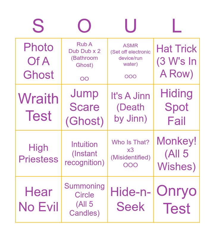 This bingo card has 16 words: Summoning Circle (All 5 Candles), Monkey! (All 5 Wishes), ASMR (Set off electronic device/run water) OOO, Photo Of A Ghost, High Priestess, Rub A Dub Dub x 2 (Bathroom Ghost) OO, Who Is That? x3 (Misidentified) OOO, Hide-n-Seek, Wraith Test, Jump Scare (Ghost), Hear No Evil, Hat Trick (3 W's In A Row), Intuition (Instant recognition), Hiding Spot Fail, It's A Jinn (Death by Jinn) and Onryo Test.