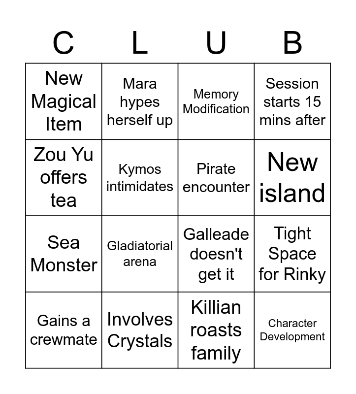 This bingo card has 16 words: Involves Crystals, Tight Space for Rinky, Memory Modification, New Magical Item, Sea Monster, Mara hypes herself up, Galleade doesn't get it, Killian roasts family, Zou Yu offers tea, Kymos intimidates, Gains a crewmate, Session starts 15 mins after, Gladiatorial arena, New island, Pirate encounter and Character Development.