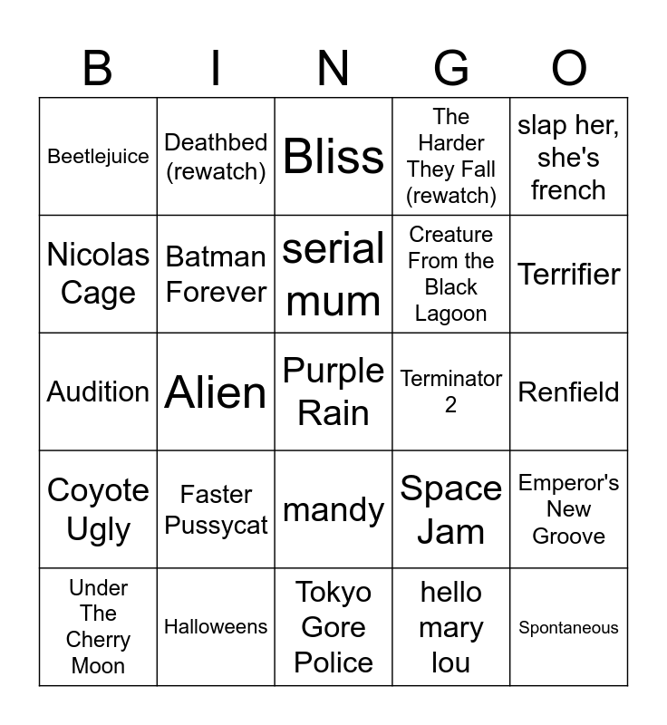 This bingo card has a free space and 83 words: Candyman (OG), Let's Scare Jessica to Death, Bliss, Raw, The Possession of Hannah Grace, The Exorcist, Desperate Living, Titane, Andover, Fifth Element, Over The Top, Roadhouse, Batman Forever, Terminator 2, Surf Nazis Must Die, Beetlejuice, Under The Cherry Moon, Nicolas Cage, The Shining, Doctor Sleep, Revenge 2017, Creature From the Black Lagoon, Spontaneous, Pumpkinhead, Alien, Old Boy, Bajirao Mastani, Massacre at Central High, The Fury, Mad God, Faster Pussycat, Jordan Peele :), Carrie, Audition, Martyrs, Demons, Tokyo Gore Police, Shape of Water, Terrifier, Coyote Ugly, Lost Highway, Mulholland Drive, Bitchass, The Blackening, We Have A Ghost, Donald Darko, Deathbed (rewatch), Knife+Heart, Sweeney Todd, Bram Stoker's Dracula, Space Jam, The Harder They Fall (rewatch), Renfield, Drop Dead Fred, Evil Dead 3, chuckies, Fridays, Freddies, Halloweens, Checks his Taintsore, Blade, kill her goats, smiley face, slap her, she's french, Flubber, Emperor's New Groove, Tyler Perry, Jerry Springer opera, Evil Dead musical, Killer sofa, people under the stairs, beyond the valley of the dolls, bound, mandy, hello mary lou, santa sangre, death becomes her, serial mum, el conde, Bats, Mickey's Mouse Trap, John and the Hole and Bit.