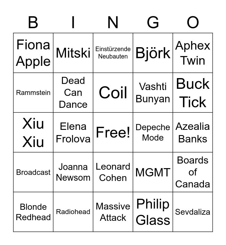 This bingo card has a free space and 24 words: Joanna Newsom, Radiohead, Coil, Blonde Redhead, Aphex Twin, Fiona Apple, Rammstein, Mitski, Depeche Mode, Leonard Cohen, Vashti Bunyan, Xiu Xiu, MGMT, Boards of Canada, Dead Can Dance, Philip Glass, Azealia Banks, Einstürzende Neubauten, Buck Tick, Elena Frolova, Sevdaliza, Broadcast, Björk and Massive Attack.