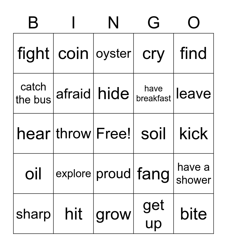 This bingo card has a free space and 28 words: have a shower, get dressed, have breakfast, get up, catch the bus, oyster, coin, oil, soil, sharp, hear, cry, hit, grow, leave, cave, explore, afraid, hide, proud, fight, village, bite, throw, kick, fang, find and soon.