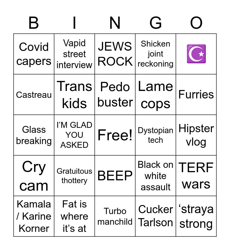 This bingo card has a free space and 24 words: Gratuitous thottery, Fat is where it’s at, Pedo buster, Kamala / Karine Korner, ☪️, Covid capers, Castreau, Vapid street interview, Dystopian tech, BEEP, Lame cops, Glass breaking, Black on white assault, TERF wars, Trans kids, Cucker Tarlson, Hipster vlog, JEWS ROCK, Furries, I’M GLAD YOU ASKED, ‘straya strong, Cry cam, Shicken joint reckoning and Turbo manchild.