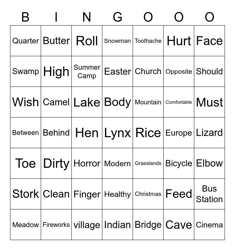 This bingo card has a free space and 62 words: Helicopter, Between, Asia, Camel, Cinema, Bus Station, Face, Jungle, High, Meadow, Snowman, Healthy, Hurt, Rice, Silly, Quarter, Opposite, Toothache, Wet, Swamp, Should, Roll, Must, Hen, Knee, Grasslands, Dirty, Cowshed, Comfortable, Elbow, Sugar, Finger, Cave, Island, Wish, Butter, Christmas, Bicycle, Church, Europe, Easter, Feed, Lake, Parade, Summer Camp, Mountain, Horror, Fireworks, Indian, Bridge, Body, Behind, Eagle, Clean, Cough, Lizard, Modern, Stork, village, traffic lights, Toe and Pasta.