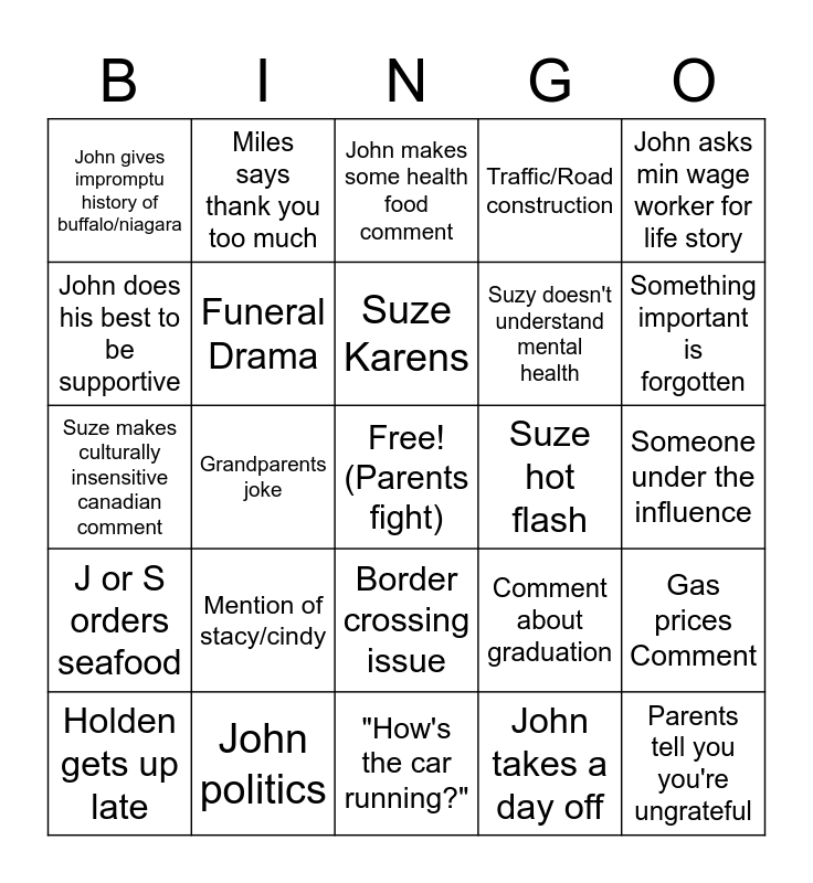 This bingo card has a free space and 34 words: Suzanne inconveniences others for pics, John takes a day off, Annie leaves a room b/c J&S fight, Loon:Spotted, J or S orders seafood, Funeral Drama, John asks min wage worker for life story, Holden gets up late, Miles says thank you too much, Miles snaps into point x2 in a row, Suze Karens, John makes some health food comment, Suze is cold, Suze is wet, Suze hot flash, Something important is forgotten, John politics, Suze makes culturally insensitive canadian comment, Mention of stacy/cindy, Comment about graduation, Border crossing issue, ~fresh fruit~, John gives impromptu history of buffalo/niagara, Someone under the influence, "How's the car running?", Parents tell you you're ungrateful, Traffic/Road construction, Parent road rage, Suzy doesn't understand mental health, John does his best to be supportive, John is a simp, Grandparents joke, Gas prices Comment and Bobby Slander.