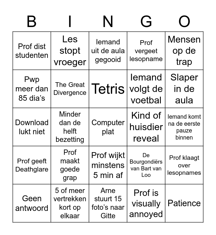 This bingo card has 47 words: CO2 meter op rood, Computer plat, Boedels vermeld, Arne stuurt 15 foto’s naar Gitte, Prof maakt goede grap, Prof afwezig, Les stopt vroeger, Pwp minder dan 30 dia’s, Pwp meer dan 85 dia’s, Professorenrivaliteit, The Great Divergence, Prof vergeet lesopname, Prof klaagt over lesopnames, De Bourgondiërs van Bart van Loo, Micro kapot, Prof geeft foute info, Tetris, Kind of huisdier reveal, Prof spreekt over privé-leven, Mensen op de trap, Minder dan de helft bezetting, Prof is visually annoyed, Prof dist studenten, Iemand volgt de voetbal, Tause wordt in LOR uitgedaagd, Slaper in de aula, Geen antwoord, 4 mensen antwoorden alles, Prof wijkt minstens 5 min af, Prof geeft Deathglare, Meme op pwp, Lokaalvergissing, Publieke schandpaal, Geen notities, Prof refereert pop culture, 5 of meer vertrekken kort op elkaar, Iemand komt na de eerste pauze binnen, Geluid niet afgezet, Online shopper, Film/serie, Patience, Iemand uit de aula gegooid, Download lukt niet, Computer kapot, Peter Stabel, Voice Crack and Verhaal van Vlaanderen.
