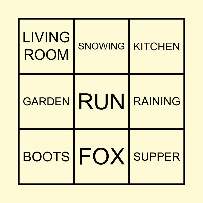 This bingo card has 140 words: JUMP, LIVING ROOM, GARAGE, MONDAY, PLANE, TEACHER, BIKE, BREAKFAST, GARDEN, SUNGLASSES, SPEAK, SMELL, MOUTH, TUNNEL, POLICE OFFICER, BOAT, SAD, WOLF, RAINCOAT, WALK, TROUSERS, SANDPIT, HELICOPTER, TRAINERS, PILOT, HAT, SNOWING, BUS, DOCTOR, READ, RAINING, OFFICE WORKER, SQUIRREL, WRITE, FOX, LISTEN, HEAR, TONGUE, SUPPER, FLY, SKIRT, BATHROOM, RUN, FINGERS, NOSE, BOOTS, DRESS, SUNNY, TOUCH, EAGLE, CLOUDY, DINNER, CAR, SATURDAY, TASTE, SOCKS, HAPPY, SNACK, DINING ROOM, GARDENER, WILD BOAR, SLIDE, SWING, SHOP KEEPER, TRAIN DRIVER, KITCHEN, MOTORBIKE, BEDROOM, SKATEBOARD, SWIM, JUMP, LIVING ROOM, GARAGE, MONDAY, PLANE, TEACHER, BIKE, BREAKFAST, GARDEN, SUNGLASSES, SPEAK, SMELL, MOUTH, TUNNEL, POLICE OFFICER, BOAT, SAD, WOLF, RAINCOAT, WALK, TROUSERS, SANDPIT, HELICOPTER, TRAINERS, PILOT, HAT, SNOWING, BUS, DOCTOR, READ, RAINING, OFFICE WORKER, SQUIRREL, WRITE, FOX, LISTEN, HEAR, TONGUE, SUPPER, FLY, SKIRT, BATHROOM, RUN, FINGERS, NOSE, BOOTS, DRESS, SUNNY, TOUCH, EAGLE, CLOUDY, DINNER, CAR, SATURDAY, TASTE, SOCKS, HAPPY, SNACK, DINING ROOM, GARDENER, WILD BOAR, SLIDE, SWING, SHOP KEEPER, TRAIN DRIVER, KITCHEN, MOTORBIKE, BEDROOM, SKATEBOARD and SWIM.