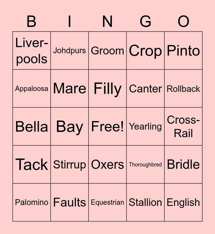 This bingo card has a free space and 34 words: Stud, Stallion, Saddle, Lope, Tack, Mare, Pinto, Palomino, Johdpurs, Jockey, Filly, Groom, Gallop, Hand, Yearling, Rollback, Faults, Bella, Stirrup, Thoroughbred, Oxers, Poles, Liver-pools, Cross-Rail, Equestrian, English, Crop, Colt, Canter, Appaloosa, Barrel, Bay, Bridle and Winter.