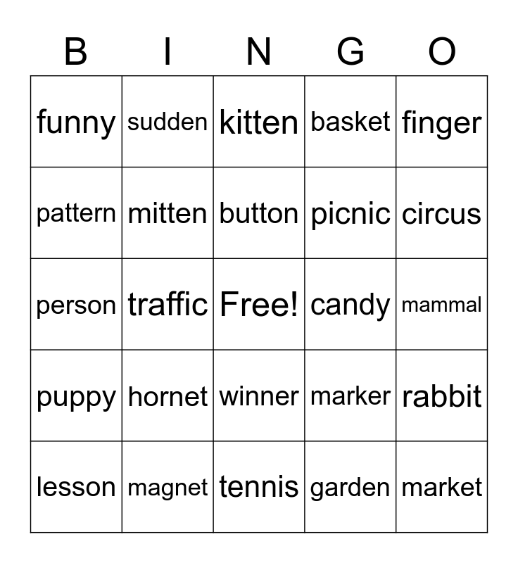 This bingo card has a free space and 28 words: rabbit, upset, picnic, garden, pattern, kitten, sudden, puppy, candy, lesson, person, basket, magnet, tennis, circus, rotten, hornet, mitten, button, winner, funny, muffin, market, traffic, mammal, marker, finger and ribbon.