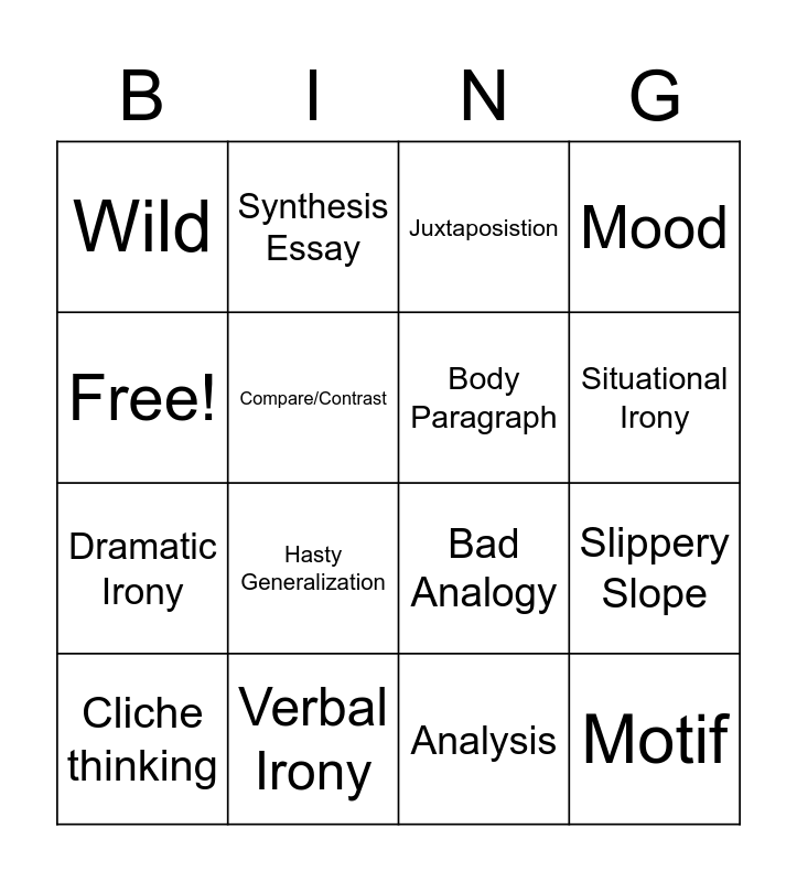 This bingo card has 16 words: Verbal Irony, Slippery Slope, Juxtaposistion, Wild, Dramatic Irony, Synthesis Essay, Bad Analogy, Analysis, Free!, Compare/Contrast, Cliche thinking, Mood, Hasty Generalization, Situational Irony, Body Paragraph and Motif.