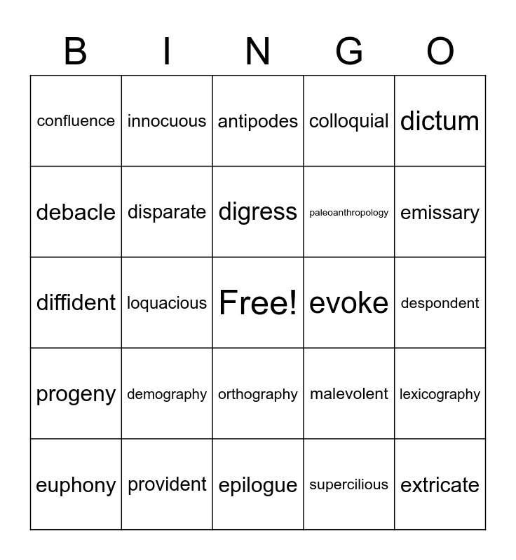 This bingo card has a free space and 78 words: affable, amorphous, antipodes, archetype, archipelago, atrophy, beneficent, bon vivant, bona fida, cartography, circumambulate, coalesce, colloquial, confluence, congenital, debacle, debilitate, demography, demote, despondent, diaphanous, dictum, diffident, digress, disparate, ductile, dyspepsia, dystrophy, electroencephalograph, elocution, emissary, endogenous, epilogue, etiology, euphony, evoke, exobiology, extemporaneous, extol, extricate, idiosyncrasy, ignominy, incredulous, indict, ineffable, innocuous, intercede, intransigent, introspection, irrevocable, lexicography, loquacious, malevolent, malign, misandry, misanthrope, misnomer, neologism, nomenclature, orthography, paleoanthropology, pedagogue, perianth, peripatetic, perspicacious, philatelist, posthumous, precocious, progeny, provident, provident, scriptorium, subjugate, subversive, supercilious, superfluous, transient and vivacious.