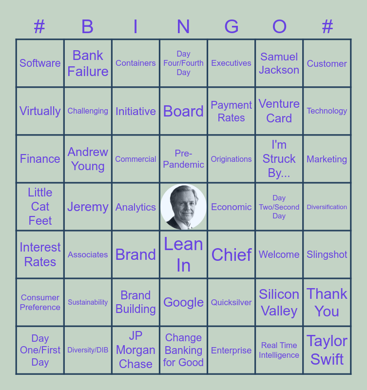 This bingo card has a free space and 79 words: Crossing the Canyon, Sustainability, Containers, Silicon Valley, Capital One, Bank, Slingshot, Lunch, Welcome, Day One/First Day, Day Two/Second Day, Day Three/Third Day, Day Four/Fourth Day, Software, Competitors, Samuel Jackson, Associates, Commercial, Small Business, Finance, Chief, Executives, Board, Virtually, Customer, Enterprise, Diversity/DIB, Change Banking for Good, Capital One Shopping, Footprint, Initiative, Outlook, Jeremy, Taylor Swift, Marketing, Technology, AI/Artificial Intelligence, Good Morning, Lean In, Venture Card, Economic, Quicksilver, Airport Lounges, Savor, Brand, Bank Failure, Diversification, Interest Rates, Card Partnerships, Social Media, I'm Struck By..., Payment Rates, Originations, Two Humps of the Camel, Moving with Confidence, Family, Consumer Preference, Flexibility, Real Time Intelligence, Pre-Pandemic, Challenging, Pulling Up/Pull Way Up, See You Tomorrow, Children/Kids, Hybrid, Strikingly Strong, Digital First Strategy, Brand Building, Seasonality, Andrew Young, Little Cat Feet, Winning, JP Morgan Chase, Google, Back to/in Office, Analytics, Tech Transformation, Thank You and Packed Agenda.