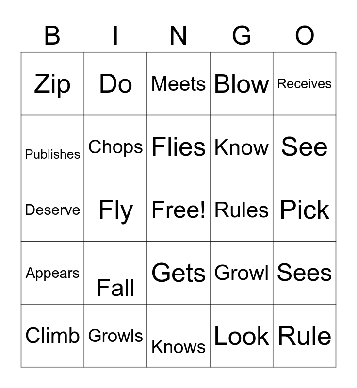 This bingo card has a free space and 24 words: Fall, Growls, Flies, Climb, Receives, Zip, Publishes, Do, Rules, Gets, Know, Deserve, Growl, Sees, Chops, Look, Pick, Meets, See, Fly, Rule, Appears, Blow and Knows.