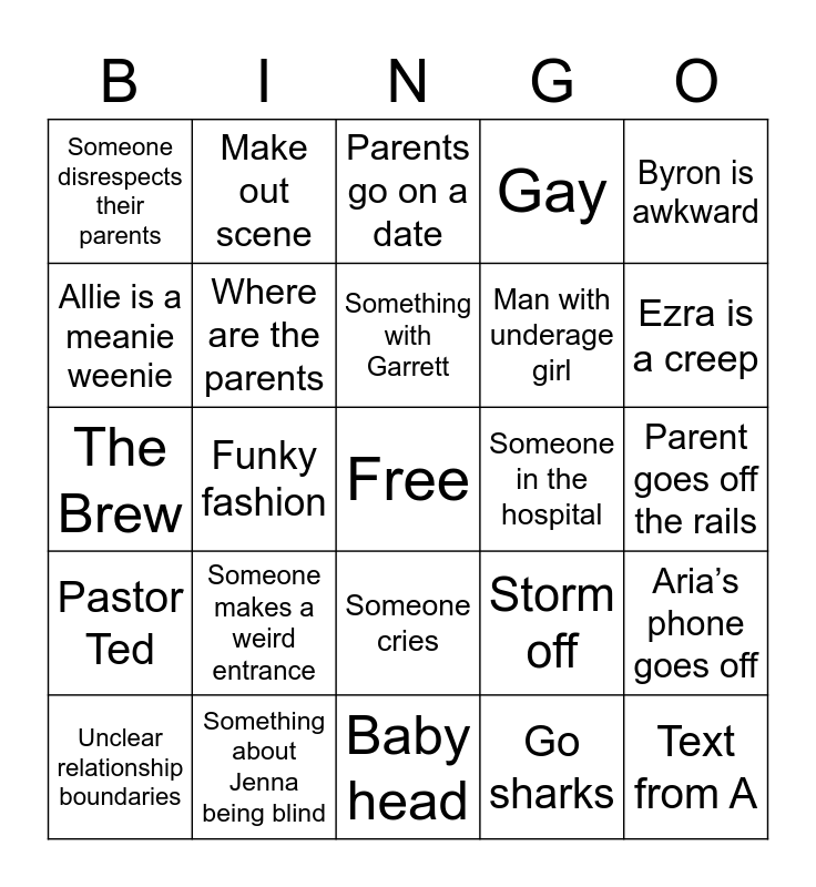 This bingo card has a free space and 24 words: Someone makes a weird entrance, Something about Jenna being blind, Something with Garrett, Unclear relationship boundaries, Byron is awkward, Someone disrespects their parents, Allie is a meanie weenie, Make out scene, Someone in the hospital, Someone cries, Man with underage girl, The Brew, Storm off, Aria’s phone goes off, Where are the parents, Go sharks, Parent goes off the rails, Parents go on a date, Ezra is a creep, Funky fashion, Text from A, Pastor Ted, Gay and Baby head.