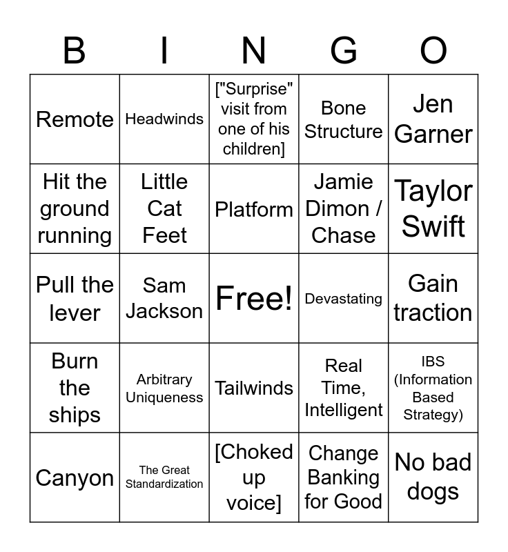 This bingo card has a free space and 57 words: Disrupt, Canyon, "Lil ol Capital One", Remote, [Choked up voice], [Tearing / Cries], Little Cat Feet, BBs dropped in a sink / where BBs come to rest, Jamie Dimon / Chase, Unleashing the Power of our Associates, Bone Structure, Unusual, COVID, Diversity, You can't get there from here, Unprecedented Times, Jen Garner, Sam Jackson, Work Backwards, No bad dogs, Devastating, Google / Amazon / Apple, Real Time, Intelligent, ["Surprise" visit from one of his children], Unassailable, Platform, Leverage, Green Shoots, Taylor Swift, Real-time, Flywheel, Risk Management, On the Shoulders of Giants, War room, Gain traction, Hit the ground running, League Tables, Pull the lever, Overdraft, Burn the ships, Headwinds, Tailwinds, Blue sky, Card always works, [Zoom Glitch], The Dream that is Capital One, Arbitrary Uniqueness, The Great Standardization, Declaration / Imperative, Machine Learning, Tech Transformation, Change Banking for Good, In the book that will never be written, Super apps, AI (x5), IBS (Information Based Strategy) and Skate to where the puck is going, not where it is.