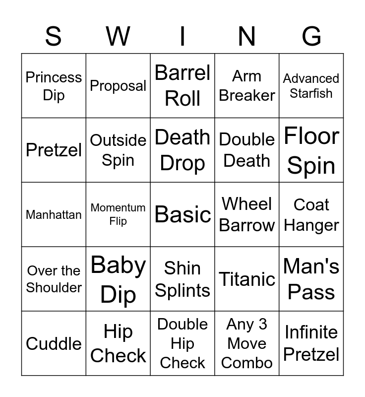 This bingo card has a free space and 24 words: Baby Dip, Hip Check, Death Drop, Cuddle, Advanced Starfish, Princess Dip, Pretzel, Proposal, Wheel Barrow, Shin Splints, Double Death, Manhattan, Titanic, Man's Pass, Outside Spin, Any 3 Move Combo, Coat Hanger, Barrel Roll, Floor Spin, Momentum Flip, Infinite Pretzel, Over the Shoulder, Arm Breaker and Double Hip Check.