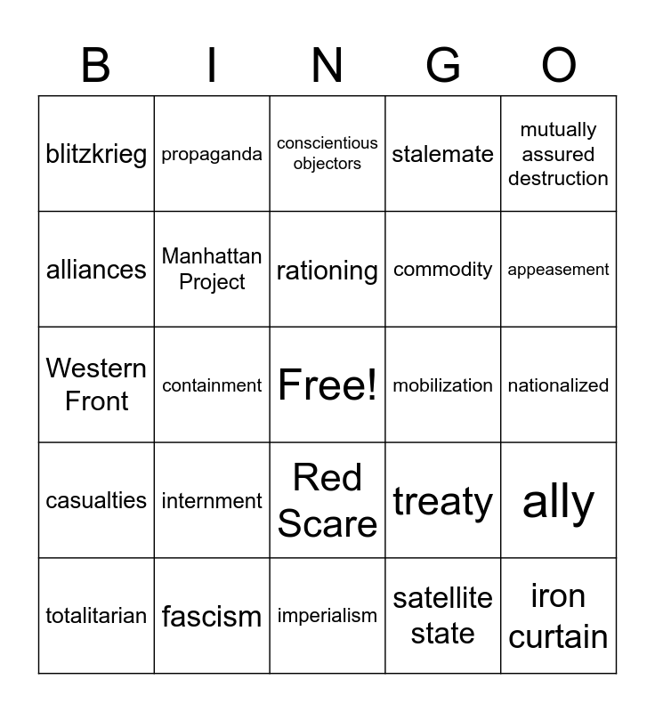 This bingo card has a free space and 27 words: treaty, Social Darwinism, commodity, imperialism, alliances, conscientious objectors, propaganda, casualties, mobilization, ally, Western Front, stalemate, totalitarian, fascism, appeasement, anti-Semitism, Manhattan Project, rationing, internment, blitzkrieg, nationalized, satellite state, containment, iron curtain, Red Scare, mutually assured destruction and Red Scare.