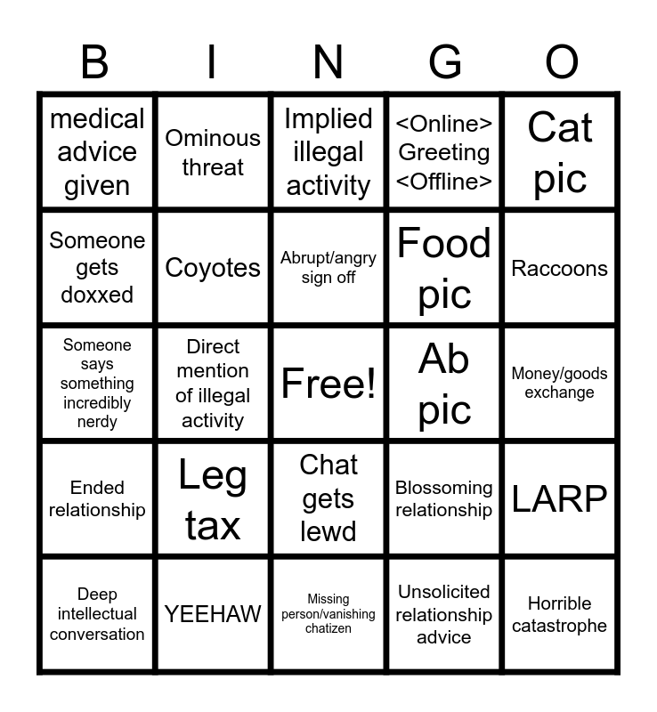 This bingo card has a free space and 24 words: Leg tax, YEEHAW, Abrupt/angry sign off, Deep intellectual conversation, Cat pic, medical advice given, Someone gets doxxed, Ominous threat, Ab pic, Chat gets lewd, Food pic, Someone says something incredibly nerdy, Blossoming relationship, LARP, Coyotes, Unsolicited relationship advice, Money/goods exchange, Implied illegal activity, Raccoons, Direct mention of illegal activity, Horrible catastrophe, Ended relationship, <Online> Greeting <Offline> and Missing person/vanishing chatizen.
