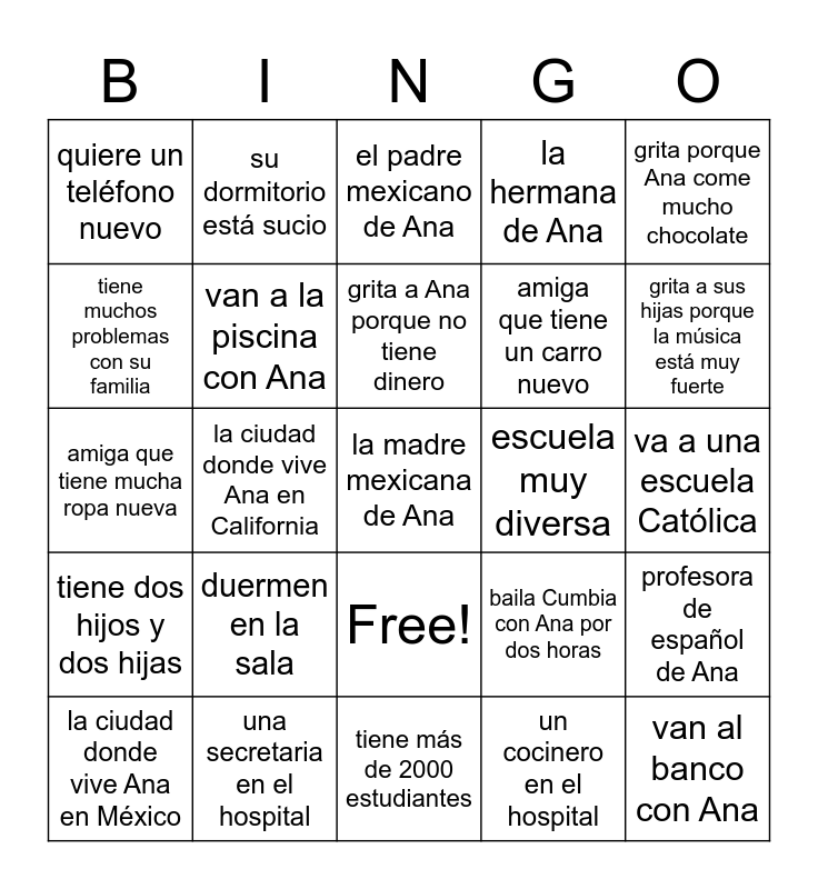 This bingo card has 26 words: Free!, un cocinero en el hospital, grita a Ana porque no tiene dinero, una secretaria en el hospital, grita porque Ana come mucho chocolate, quiere un teléfono nuevo, tiene muchos problemas con su familia, su dormitorio está sucio, va a una escuela Católica, baila Cumbia con Ana por dos horas, amiga que tiene un carro nuevo, amiga que tiene mucha ropa nueva, profesora de español de Ana, la ciudad donde vive Ana en México, la ciudad donde vive Ana en California, el hermano de Ana, la hermana de Ana, tiene dos hijos y dos hijas, el padre mexicano de Ana, la madre mexicana de Ana, grita a sus hijas porque la música está muy fuerte, tiene más de 2000 estudiantes, escuela muy diversa, duermen en la sala, van a la piscina con Ana and van al banco con Ana.