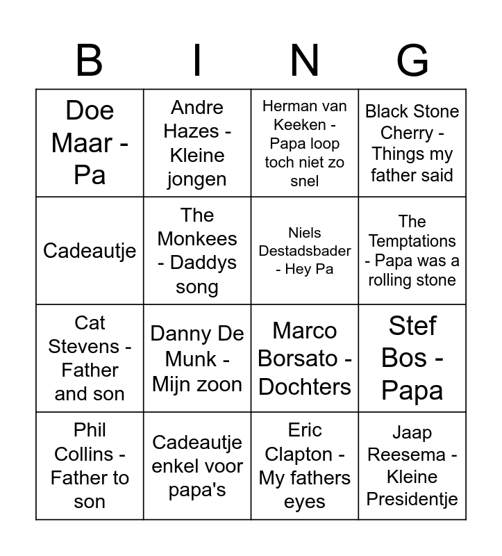 This bingo card has 16 words: Cadeautje enkel voor papa's, Stef Bos - Papa, Herman van Keeken - Papa loop toch niet zo snel, Doe Maar - Pa, Cat Stevens - Father and son, Andre Hazes - Kleine jongen, Marco Borsato - Dochters, Eric Clapton - My fathers eyes, Cadeautje, The Monkees - Daddys song, Phil Collins - Father to son, Black Stone Cherry - Things my father said, Danny De Munk - Mijn zoon, The Temptations - Papa was a rolling stone, Niels Destadsbader - Hey Pa and Jaap Reesema - Kleine Presidentje.