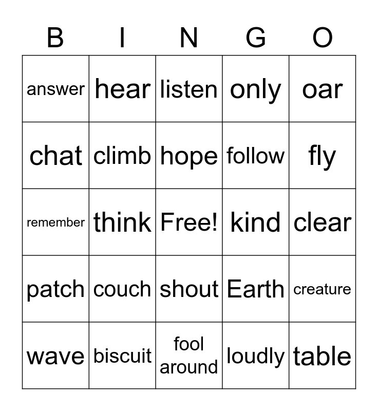 This bingo card has a free space and 24 words: couch, biscuit, hope, wave, oar, answer, chat, hear, kind, shout, follow, remember, Earth, creature, climb, loudly, clear, listen, fly, think, table, patch, only and fool around.