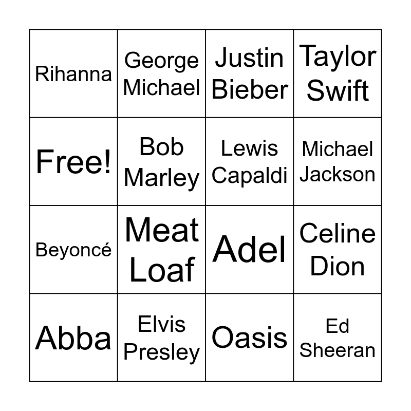 This bingo card has 16 words: Elvis Presley, Celine Dion, Justin Bieber, Rihanna, Beyoncé, George Michael, Adel, Oasis, Free!, Bob Marley, Abba, Taylor Swift, Meat Loaf, Michael Jackson, Lewis Capaldi and Ed Sheeran.