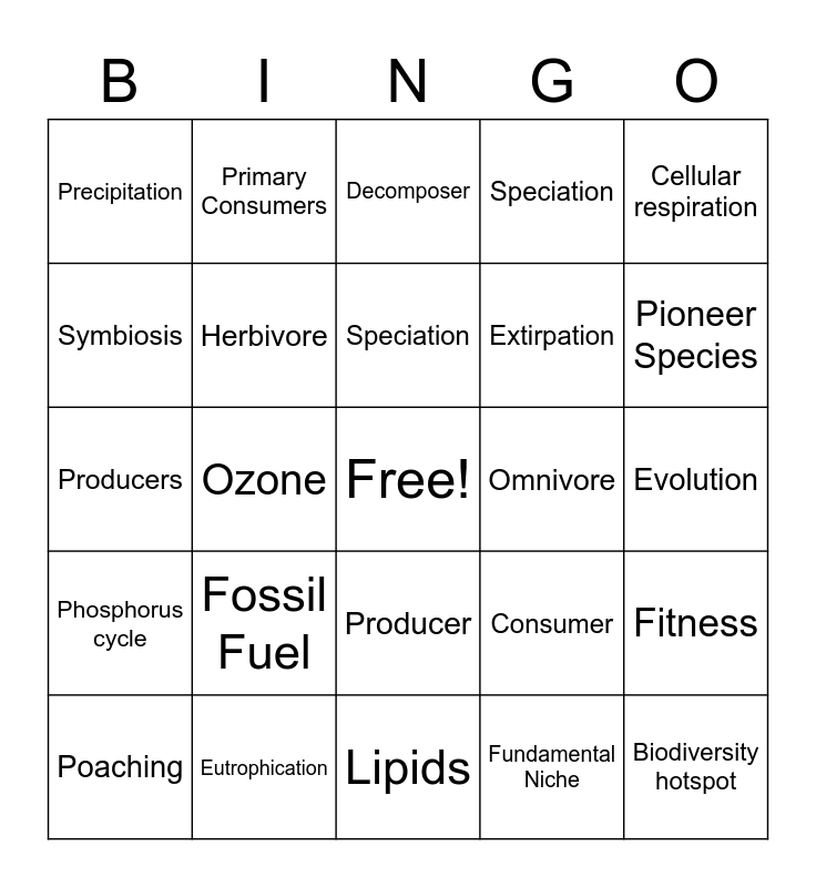 This bingo card has a free space and 137 words: ES FINAL EXAM TERMS FOR BINGO, Element, Molecule, Hydrocarbons (Organic compounds), Proteins, Carbohydrates, Lipids, Nucleic acid, Acid, Base, pH scale, Geosphere, Biosphere, Atmosphere, Lithosphere, Hydrosphere, Ozone, Water cycle, Evaporation, Condensation, Transpiration, Runoff, Precipitation, Carbon cycle, Photosynthesis, Cellular respiration, Producers, Consumers, Decomposers, Fossil fuel, Phosphorus cycle, Eutrophication, Nitrogen cycle, Fertilizer, Fixation, Denitrification, Biodiversity, Genetic diversity, Species diversity, Ecosystem diversity, Speciation, Biodiversity Distribution, Latitudinal gradient, Ecosystem services, Resistant, Resilient, Keystone species, Producers, Primary Consumers, Secondary Consumers, Extinction, Extirpation, Endangered, Threatened, Background rate of extinction, Mass extinction, Habitat fragmentation, Invasive species, Overharvesting, Poaching, Endangered Species Act (ESA), Treaty, Convention on International Trade in Endangered Species (CITES), Captive breeding, Cloning, Biodiversity hotspot, Endemic species, Community-based conservation, Debt-for-nature swap (DNS), Conservation concession, Wildlife corridor, Producer, Consumer, Primary Consumer, Secondary Consumer, Tertiary Consumer, Herbivore, Omnivore, Carnivore, Decomposer, Apex Predator, Keystone Species, Biomass, Food Chain, Food Web, Trophic Level, Evolution, Mutation, Migration, Genetic Drift, Natural Selection, Fitness, Adaptation, Artificial Selection, Speciation, Niche, Competition, Tolerance, Fundamental Niche, Realized Niche, Predation, Predator, Prey, Coevolution, Symbiosis, Parasitism, Parasite, Host, Herbivory, Mutualism, Commensalism, Primary Succession, Climax Community, Pioneer Species, Secondary Succession, Aquatic Succession, Greenhouse Effect, Greenhouse Gases, Fossil Fuel, Infrared Light, Absorption, Radiation, Sunspot, Prevailing Winds, El Niño, La Niña, Topography, Altitude, Climate Change, IPCC, Weather, Climate, Computer Model, Sediment, Ice Core Samples, Tree Rings and Coral Bleaching.