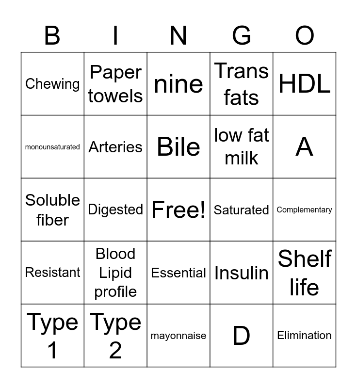 This bingo card has a free space and 27 words: Insulin, Legume, low fat milk, mayonnaise, monounsaturated, nine, Paper towels, Resistant, Saturated, Shelf life, Soluble fiber, Trans fats, Type 1, Type 2, A, Allergens, Arteries, Bile, Blood Lipid profile, Chewing, Complementary, D, Digested, Elimination, Essential, HDL and heart disease.
