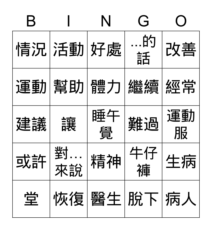 This bingo card has a free space and 24 words: 對…來說, 恢復, 體力, 堂, 改善, 情況, 運動, 活動, 難過, 精神, 繼續, 建議, 牛仔褲, 生病, 幫助, 脫下, 運動服, 好處, 經常, 讓, 病人, 或許, ...的話 and 醫生.