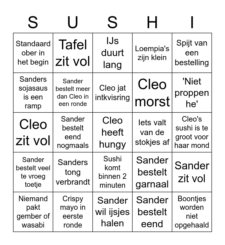 This bingo card has a free space and 24 words: Sanders tong verbrandt, Crispy mayo in eerste ronde, Cleo jat intkvisring, Niemand pakt gember of wasabi, Spijt van een bestelling, Standaard ober in het begin, Sanders sojasaus is een ramp, Tafel zit vol, Iets valt van de stokjes af, Sushi komt binnen 2 minuten, Cleo morst, Cleo zit vol, Sander bestelt garnaal, Sander zit vol, Sander bestelt meer dan Cleo in een ronde, Sander bestelt eend, Cleo's sushi is te groot voor haar mond, IJs duurt lang, 'Niet proppen he', Sander bestelt eend nogmaals, Boontjes worden niet opgehaald, Sander bestelt veel te vroeg toetje, Loempia's zijn klein and Sander wil ijsjes halen.