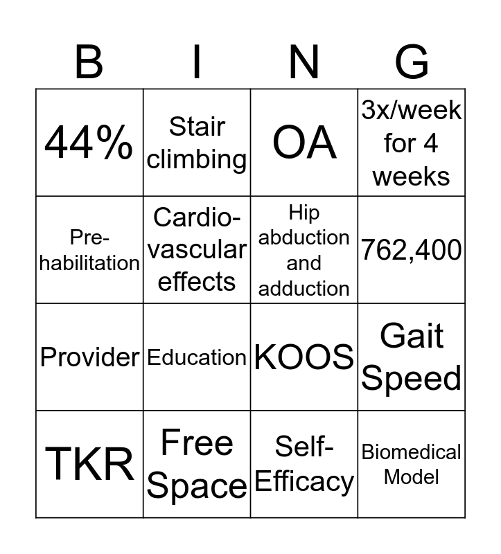 This bingo card has a free space and 15 words: TKR, Biomedical Model, OA, 44%, 762,400, Pre-habilitation, Education, Self-Efficacy, Cardio-vascular effects, Provider, Gait Speed, 3x/week for 4 weeks, Hip abduction and adduction, Stair climbing and Free Space.