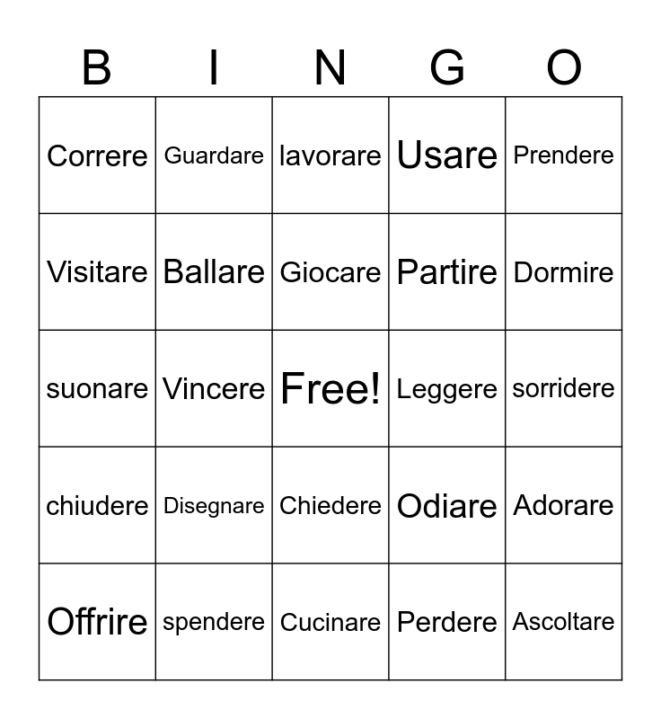 This bingo card has a free space and 49 words: Mangiare, Ascoltare, Nuotare, Cucinare, Disegnare, Studiare, Guardare, Comprare, Visitare, Cantare, Ballare, Usare, Adorare, Odiare, Parlare, Viaggiare, Giocare, Leggere, Scrivere, Prendere, Vincere, Perdere, Correre, Partire, Servire, Dormire, Offrire, Sentire, Chiedere, chiudere, accendere, rispondere, finire, pulire, spendere, mettere, prendere, ridere, sorridere, imparare, insegnare, rompere, cadere, vendere, suonare, lavorare, abitare, portare and telefonare.