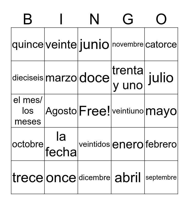 This bingo card has a free space and 24 words: la fecha, once, doce, trece, catorce, quince, dieciseis, veinte, veintiuno, veintidos, trenta y uno, el mes/ los meses, enero, febrero, marzo, abril, mayo, junio, julio, Agosto, septembre, octobre, novembre and dicembre.