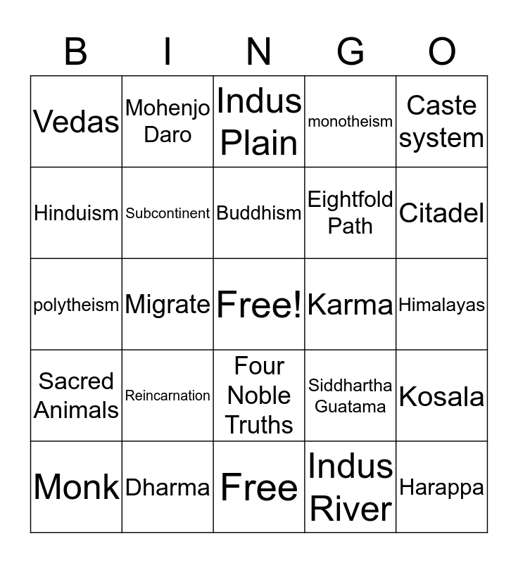 This bingo card has a free space and 24 words: Reincarnation, Dharma, Buddhism, Monk, Caste system, Vedas, Hinduism, Mohenjo Daro, Karma, Four Noble Truths, Eightfold Path, polytheism, Siddhartha Guatama, Kosala, Subcontinent, Indus River, Himalayas, Indus Plain, Citadel, Migrate, Harappa, Sacred Animals, monotheism and Free.