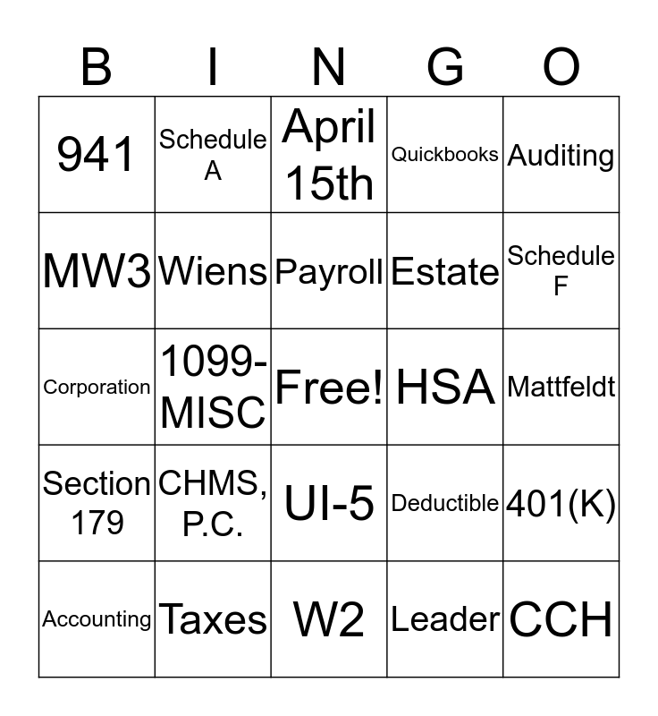 This bingo card has a free space and 24 words: CHMS, P.C., Taxes, Payroll, Accounting, Auditing, 941, MW3, Schedule A, HSA, UI-5, Estate, Corporation, Deductible, 401(K), Wiens, Leader, Mattfeldt, April 15th, Schedule F, 1099-MISC, CCH, Section 179, Quickbooks and W2.