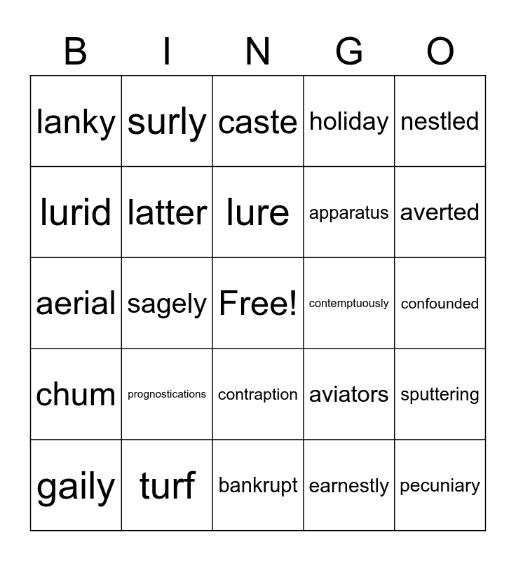 This bingo card has a free space and 24 words: prognostications, turf, lure, gaily, nestled, lanky, lurid, surly, contemptuously, contraption, apparatus, aerial, aviators, sputtering, latter, earnestly, confounded, caste, averted, sagely, pecuniary, chum, holiday and bankrupt.