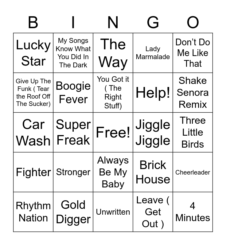 This bingo card has a free space and 67 words: Footloose, Fat Bottom girls, Lady Madonna, Cheerleader, Black or White, Song 2, My Songs Know What You Did In The Dark, Everybody Talk, You Got it ( The Right Stuff), Obsessed, Always Be My Baby, Good Golly Miss Molly, Three Little Birds, Don’t Do Me Like That, Come and Get Your Love, Give Up The Funk ( Tear the Roof Off The Sucker), Super Freak, Lucky Star, Flashdance … What A feeling, Help!, Stronger, Fighter, Lady Marmalade, Leave ( Get Out ), So What, Bang Bang, Circles, Hold On, Shake Senora Remix, Do you Love Me, 4 Minutes, Trumpets, I’m A Survivor, It’s Tricky, Life In The Fast Lane, Rhythm Nation, You’re the first, The Last , My Everything, Brick House, Car Wash, December, 1963 ( Oh What a Night ), Electric Boogie, Boogie Fever, Jiggle Jiggle, Don’t you Worry ‘Bout A Thing, Every Little Step, Hangin’ Tough, Be like That, Gold Digger, Heathens, Kickstart My Heart, The Way, Ho Hey, You Belong With Me, Teenage Dream, Disturbia, Unwritten, The Final Countdown, Just The Way You Are, Home, Halo, Rumour Has It, Shower, Love You Like A Love Song, 7 Rings, Dangerous Woman, Focus and DESPECHA.