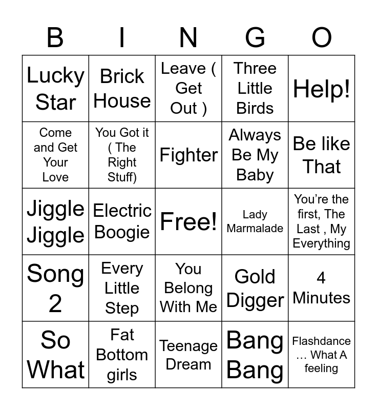 This bingo card has a free space and 62 words: Footloose, Fat Bottom girls, Lady Madonna, Song 2, My Songs Know What You Did In The Dark, Everybody Talk, You Got it ( The Right Stuff), Obsessed, Always Be My Baby, Good Golly Miss Molly, Three Little Birds, Don’t Do Me Like That, Come and Get Your Love, Give Up The Funk ( Tear the Roof Off The Sucker), Super Freak, Lucky Star, Flashdance … What A feeling, Help!, Stronger, Fighter, Lady Marmalade, Leave ( Get Out ), So What, Bang Bang, Circles, Hold On, Shake Senora Remix, Do you Love Me, 4 Minutes, Trumpets, I’m A Survivor, It’s Tricky, Life In The Fast Lane, Rhythm Nation, You’re the first, The Last , My Everything, Brick House, Car Wash, December, 1963 ( Oh What a Night ), Electric Boogie, Boogie Fever, Jiggle Jiggle, Don’t you Worry ‘Bout A Thing, Every Little Step, Hangin’ Tough, Be like That, Gold Digger, Heathens, Kickstart My Heart, The Way, Ho Hey, You Belong With Me, Teenage Dream, Disturbia, Unwritten, The Final Countdown, Just The Way You Are, Home, Halo, Rumour Has It, Dangerous Woman, Focus and DESPECHA.