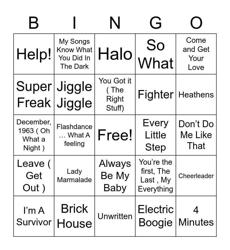 This bingo card has a free space and 65 words: Footloose, Fat Bottom girls, Lady Madonna, Cheerleader, Black or White, Song 2, My Songs Know What You Did In The Dark, Everybody Talk, You Got it ( The Right Stuff), Obsessed, Always Be My Baby, Good Golly Miss Molly, Don’t Do Me Like That, Come and Get Your Love, Give Up The Funk ( Tear the Roof Off The Sucker), Super Freak, Flashdance … What A feeling, Help!, Stronger, Fighter, Lady Marmalade, Leave ( Get Out ), So What, Bang Bang, Circles, Hold On, Shake Senora Remix, Do you Love Me, 4 Minutes, Trumpets, I’m A Survivor, It’s Tricky, Life In The Fast Lane, Rhythm Nation, You’re the first, The Last , My Everything, Brick House, Car Wash, December, 1963 ( Oh What a Night ), Electric Boogie, Boogie Fever, Jiggle Jiggle, Don’t you Worry ‘Bout A Thing, Every Little Step, Hangin’ Tough, Be like That, Gold Digger, Heathens, Kickstart My Heart, The Way, Ho Hey, You Belong With Me, Teenage Dream, Disturbia, Unwritten, The Final Countdown, Just The Way You Are, Home, Halo, Rumour Has It, Shower, Love You Like A Love Song, 7 Rings, Dangerous Woman, Focus and DESPECHA.