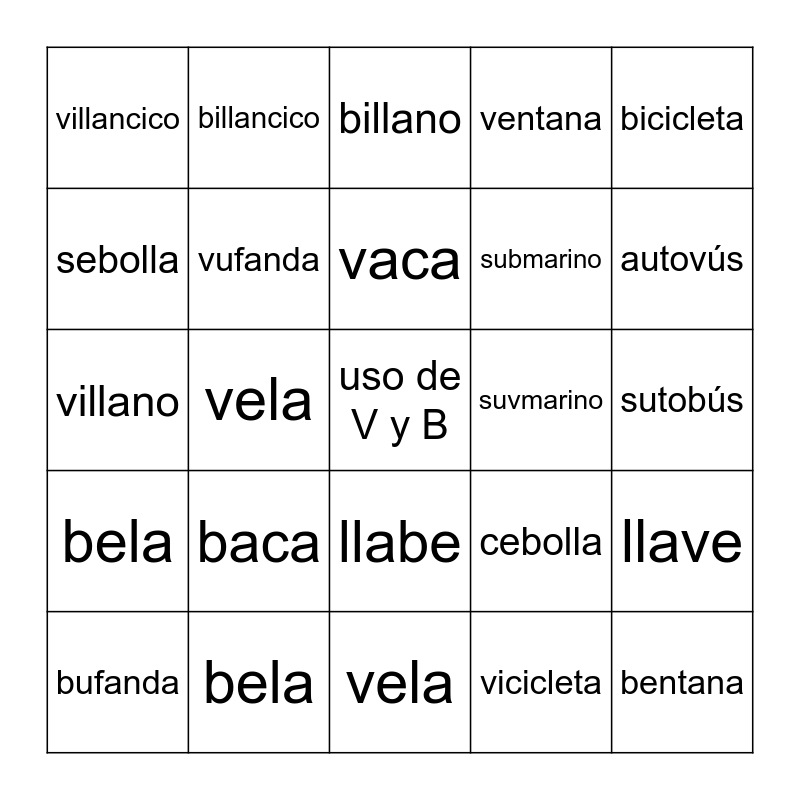 This bingo card has a free space and 24 words: baca, bela, vaca, bufanda, bicicleta, villancico, sebolla, billancico, suvmarino, llabe, submarino, villano, cebolla, llave, vufanda, vicicleta, sutobús, billano, autovús, vela, bentana, bela, ventana and vela.