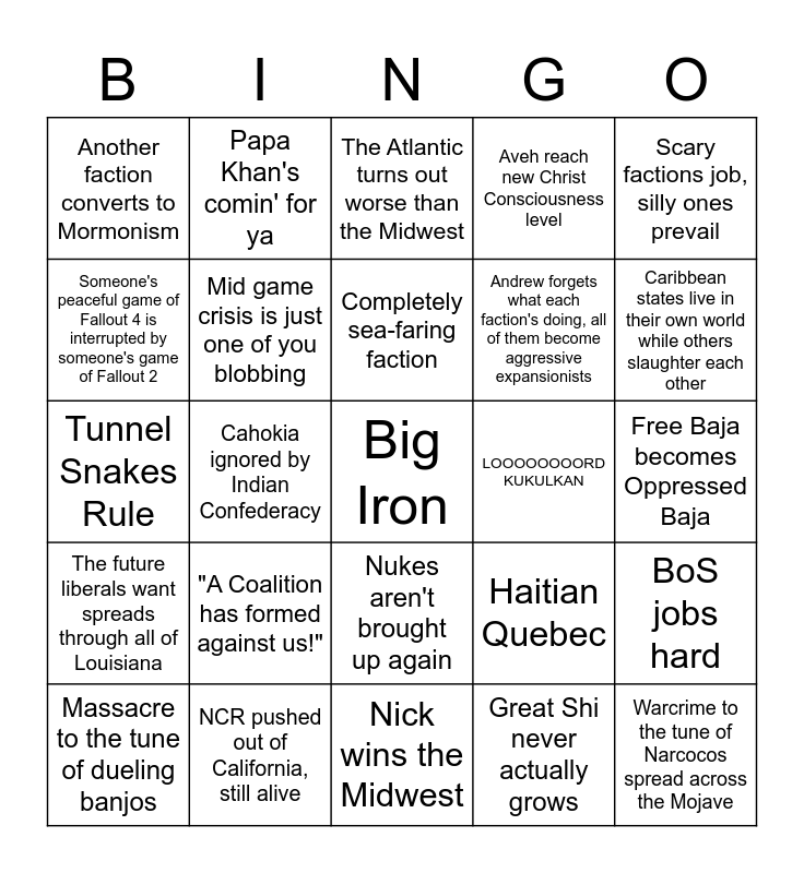 This bingo card has a free space and 24 words: "A Coalition has formed against us!", NCR pushed out of California, still alive, Completely sea-faring faction, Massacre to the tune of dueling banjos, Scary factions job, silly ones prevail, Another faction converts to Mormonism, Someone's peaceful game of Fallout 4 is interrupted by someone's game of Fallout 2, Papa Khan's comin' for ya, LOOOOOOOORD KUKULKAN, Nukes aren't brought up again, Andrew forgets what each faction's doing, all of them become aggressive expansionists, Tunnel Snakes Rule, Haitian Quebec, BoS jobs hard, Mid game crisis is just one of you blobbing, Great Shi never actually grows, Free Baja becomes Oppressed Baja, The Atlantic turns out worse than the Midwest, Caribbean states live in their own world while others slaughter each other, Cahokia ignored by Indian Confederacy, Warcrime to the tune of Narcocos spread across the Mojave, The future liberals want spreads through all of Louisiana, Aveh reach new Christ Consciousness level and Nick wins the Midwest.