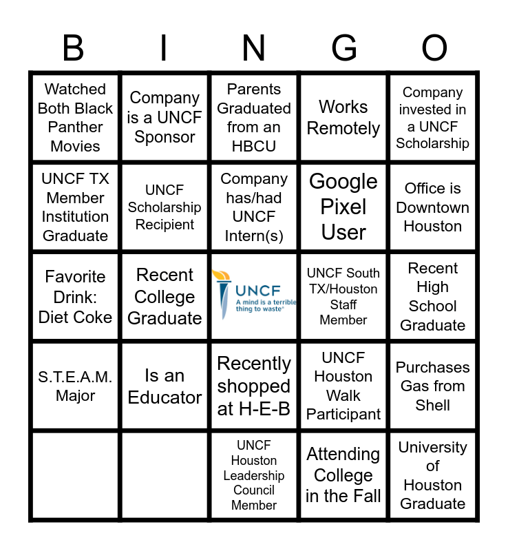 This bingo card has a free space and 24 words: Favorite Drink: Diet Coke, Community /Corporate Affairs Professional, Recent High School Graduate, Is an Educator, Parents Graduated from an HBCU, Works Remotely, Company invested in a UNCF Scholarship, Watched Both Black Panther Movies, Recent College Graduate, UNCF Houston Walk Participant, Purchases Gas from Shell, Company is a UNCF Sponsor, Recently shopped at H-E-B, Attending College in the Fall, Office is Downtown Houston, S.T.E.A.M. Major, Company has/had UNCF Intern(s), Google Pixel User, University of Houston Graduate, UNCF TX Member Institution Graduate, UNCF Scholarship Recipient, UNCF Houston Leadership Council Member, UNCF South TX/Houston Staff Member and UNCF South TX Volunteer.