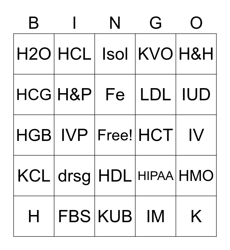 This bingo card has a free space and 24 words: drsg, FBS, Fe, H, H&H, H2O, HCG, HCL, HCT, HDL, LDL, HGB, HIPAA, HMO, H&P, IM, IV, Isol, IUD, IVP, K, KCL, KVO and KUB.