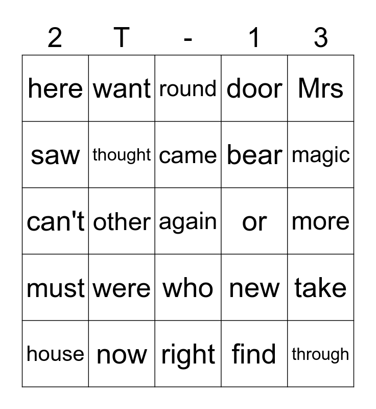 This bingo card has a free space and 24 words: were, now, came, house, Mrs, here, saw, want, or, who, bear, can't, new, take, thought, find, more, round, magic, other, through, must, door and right.